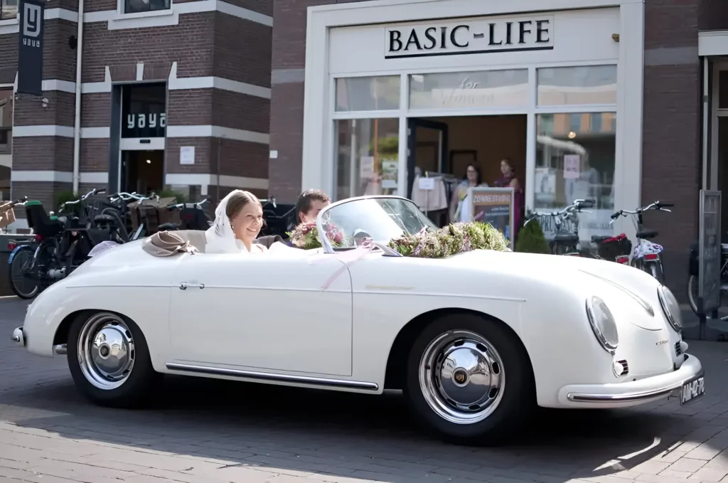 De Porsche trouwauto, 356 Speedster uit 1957, staat helemaal voor jullie klaar. Deze prachtige auto is uitgevoerd met een crèmekleurig interieur en een crèmekleurige kap (het dak kan zowel open als dicht) – een schitterende combinatie van bijpassende tinten. Deze Porsche straalt pure klasse en stijl uit.
