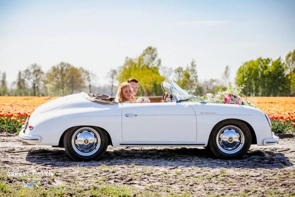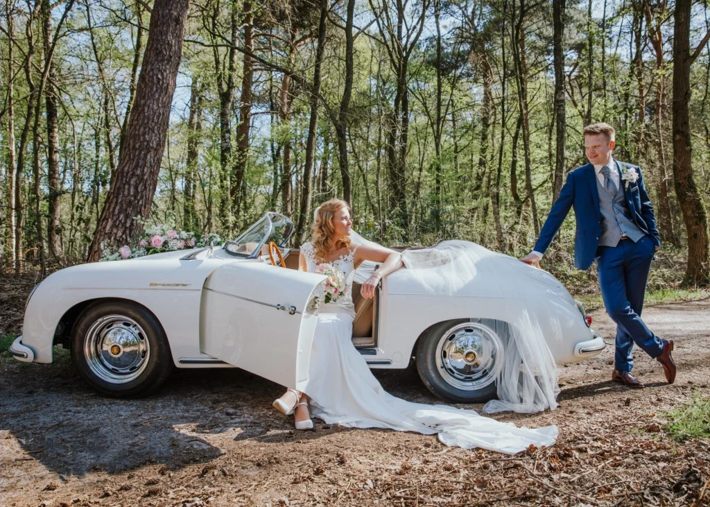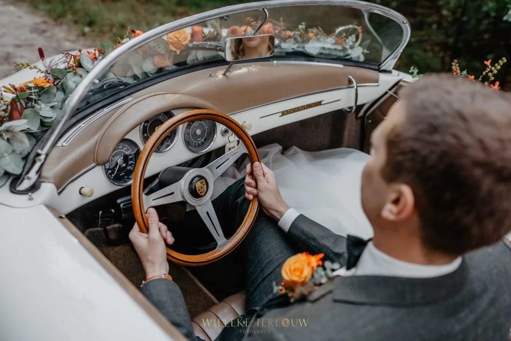 Een superromantische trouwauto met een prachtige combinatie van bijpassende tinten. En aangezien het zonnetje op jullie bruiloft ongetwijfeld zal schijnen, is deze mooie klassieker perfect om mee op pad te gaan. Natuurlijk kun je op je trouwdag ook een wandeling maken of een stukje fietsen, maar je trouwdag beleven in een Porsche is toch nét iets specialer. Daarom hebben we voor jullie deze klassieke Porsche Speedster 356 uit 1957 — de ultieme trouwauto.